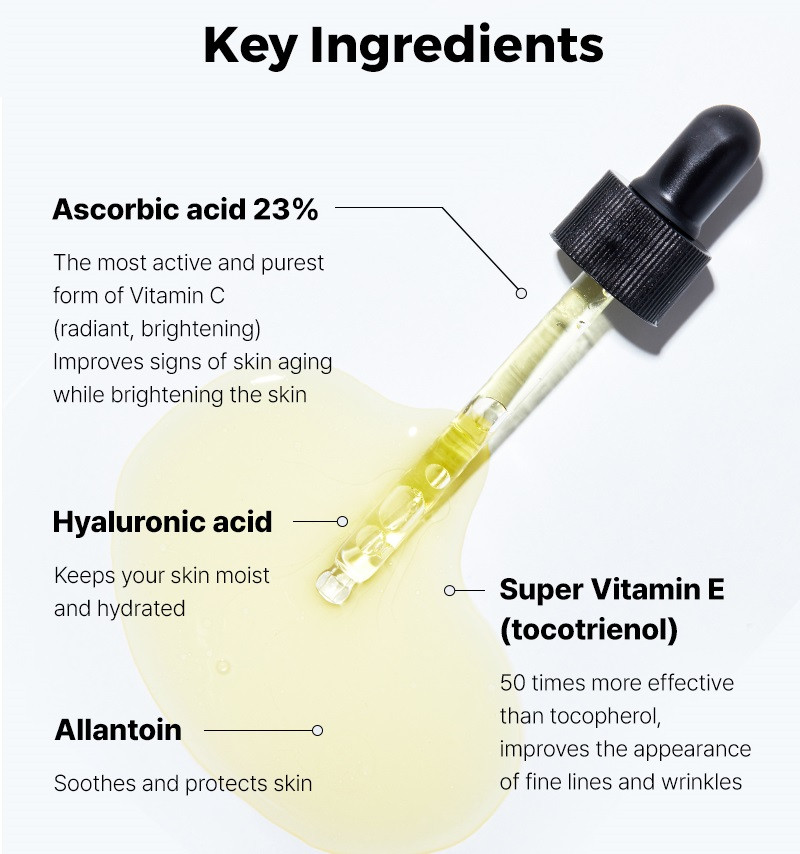 Ingredients: Water, Ascorbic Acid, Propanediol, Dimethicone, Tromethamine, Panthenol, 3-O-Ethyl Ascorbic Acid, Squalane, Caffeine, Sodium Chloride, Sodium Hyaluronate, Disodium EDTA, Sodium Sulfite, Glutathione, Adenosine, Gardenia Florida Fruit Extract, Dextrin, Acetyl Glucosamine, Allantoin, Tocotrienols, Tocopherol, Elaeis Guineensis (Palm) Oil, Niacinamide, Butylene Glycol, Arginine, Alcohol Denat., Pentylene Gylcol, Glycyrrhiza Glabra (Licorice) Root Extract, Tocopherol, Carthamus Tinctorius (Safflower) Seed Oil, Helianthus Annuus (Sunflower) Seed Oil, Camellia Japonica Seed Oil, Methyl Trimethicone, Helianthus Annuus (Sunflower) Seed Oil, Daucus Carota Sativa (Carrot) Root Extract, Beta-Carotene, Tocopherol.