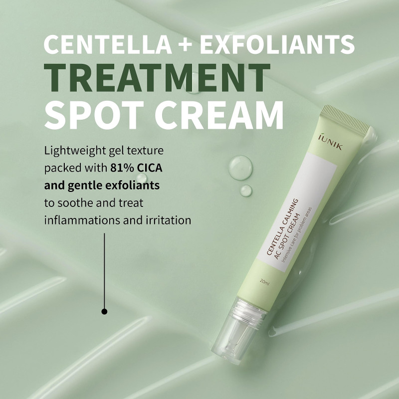 The iUNIK Centella Calming AC Spot Cream is enriched with 81% Centella Asiatica Extract for intensively soothing irritated skin. AHA, BHA and PHA gently remove dead skin cells and excessive sebum making impurities disappear like snow in the sun. The Spot Cream has a refreshing, non-sticky texture which absorbs quickly into the skin.