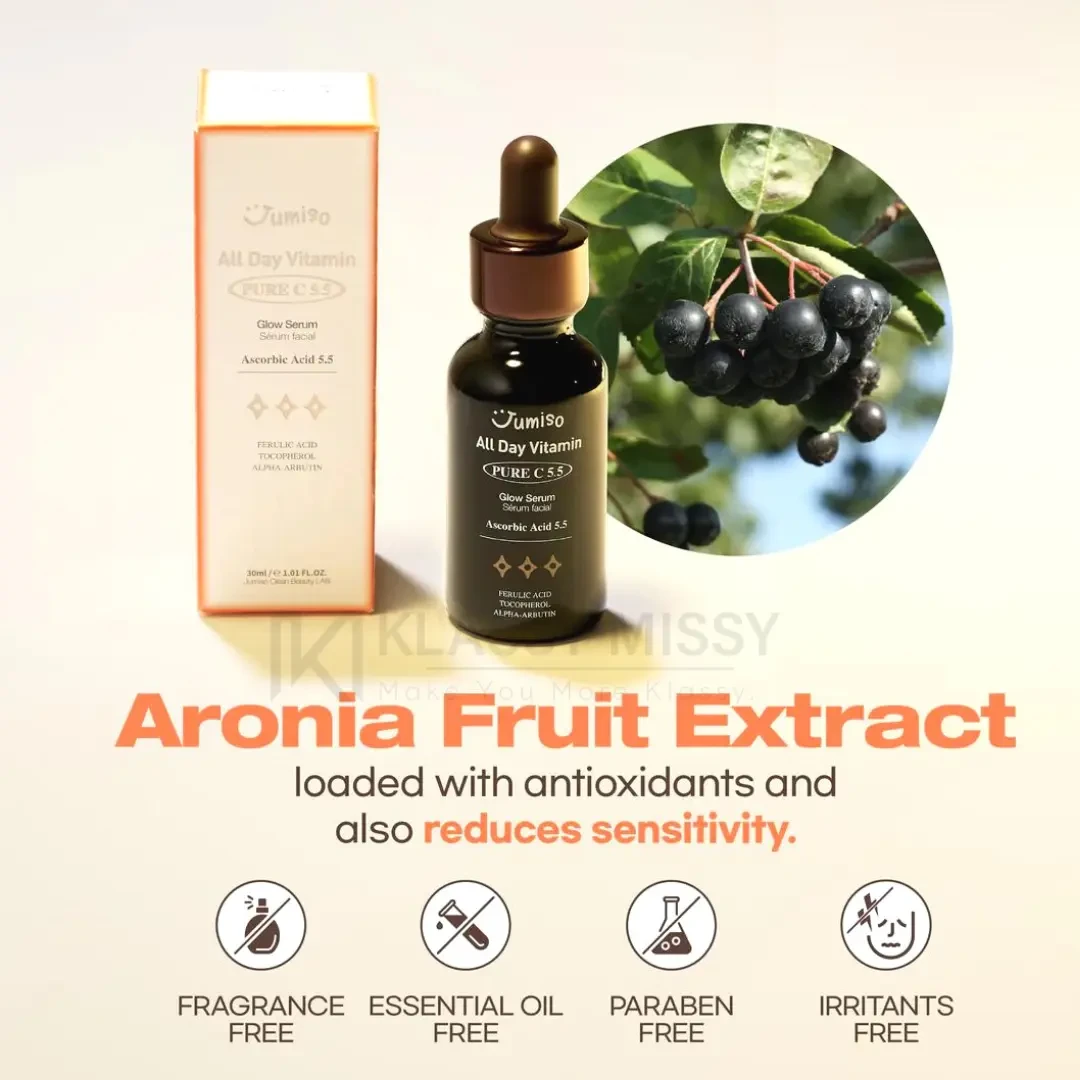 Jumiso All Day Vitamin Pure C 5.5 Glow Serum designed to brighten and revitalize dull skin. It contains 5.5% pure vitamin C, which is known for its powerful antioxidant and anti-aging properties. The serum is also enriched with other natural ingredients such as centella asiatica extract, niacinamide, and hyaluronic acid, which help to hydrate and soothe the skin while reducing the appearance of fine lines and wrinkles. The lightweight formula absorbs quickly into the skin and can be used daily to improve skin tone and texture, leaving a healthy, radiant glow.