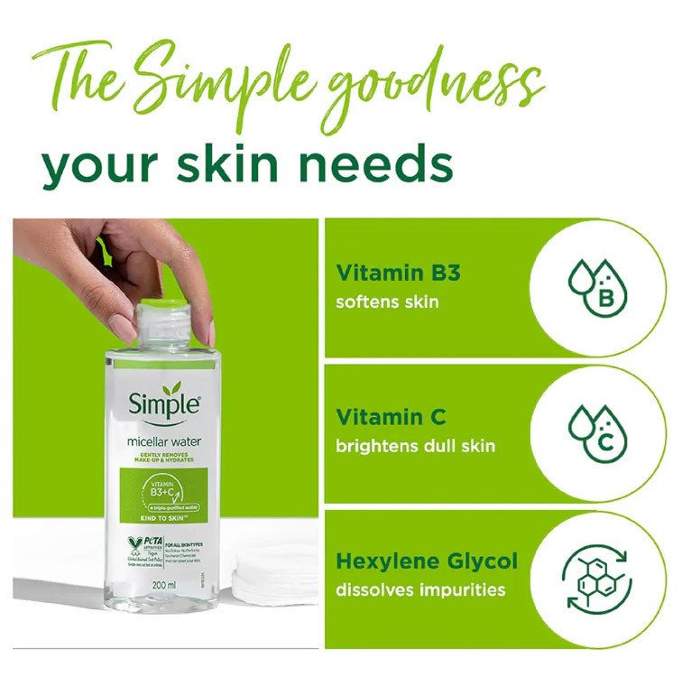 Simple Micellar Cleansing Water is our most advanced yet gentle facial cleanser to date. It helps remove contaminants known to irritate skin and leaves it clean and fresh. It instantly boosts skin hydration by 90%! This innovative facial cleanser is made with skin-loving ingredients perfect for all skin types, including Vitamin B3, Vitamin C and Triple Purified Water. It contains no artificial perfumes, no color or dye and no harsh chemicals that can upset your skin, making it perfect even for sensitive skin. Dermatologically Tested & Approved.Ophtalmologically tested. Hypoallergenic,non-comedogenic.