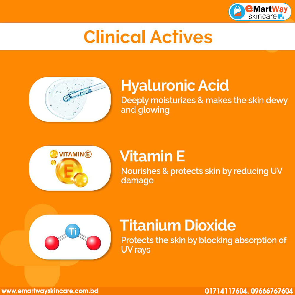 Aqua, C12-15 Alkyl Benzoate, Ethylhexyl Methoxycinnamate, Dimethicone, Sodium Acrylates Copolymer, Butyl Methoxydibenzoylmethane, Hyaluronic Acid, Glycerin, Benzophenone-3, 1,3-Butylene Glycol, Phenoxyethanol, Lecithin, Aloe Barbadensis (Aloe Vera) Leaf Juice, Xylitol, Glucose, Sodium Levulinate, Phospholipids, Propylene Glycol, Ethoxydiglycol, Anhydroxylitol, Oxothiazolidine, Helianthus Annuus (Sunflower) Seed Oil, Glyceryl Stearate, Allantoin, D-Alpha Tocopheryl Acetate, Phoenix Dactylifera Extract, Vaccinum Sect. Cyanococcus (Blueberry) Fruit Extract , Citrus Paradisi (Grapefruit) Extract, Zinc Oxide, Cyclopentasiloxane, PEG-10 Dimethicone, E-Ascorbic Acid, C9-12 Alkane, Hydrogen Dimethicone, Titanium Dioxide, Aluminum Hydroxide, Polyhydroxystearic Acid.